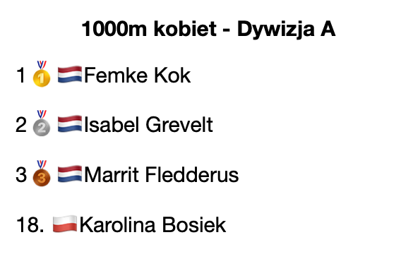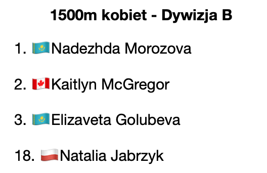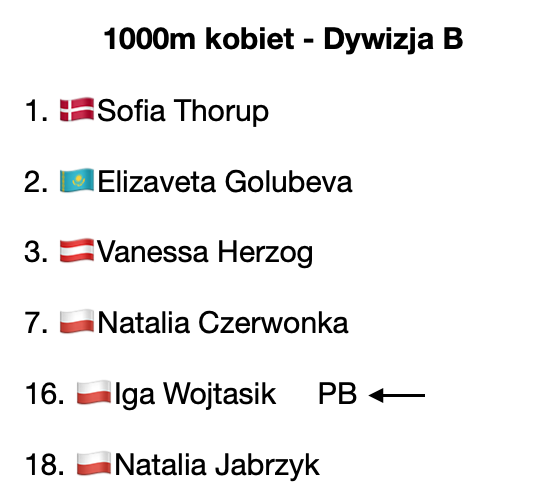 🏆14:00 – 1000m kobiet – Dywizja A (🇵🇱K. Bosiek) – Wyniki