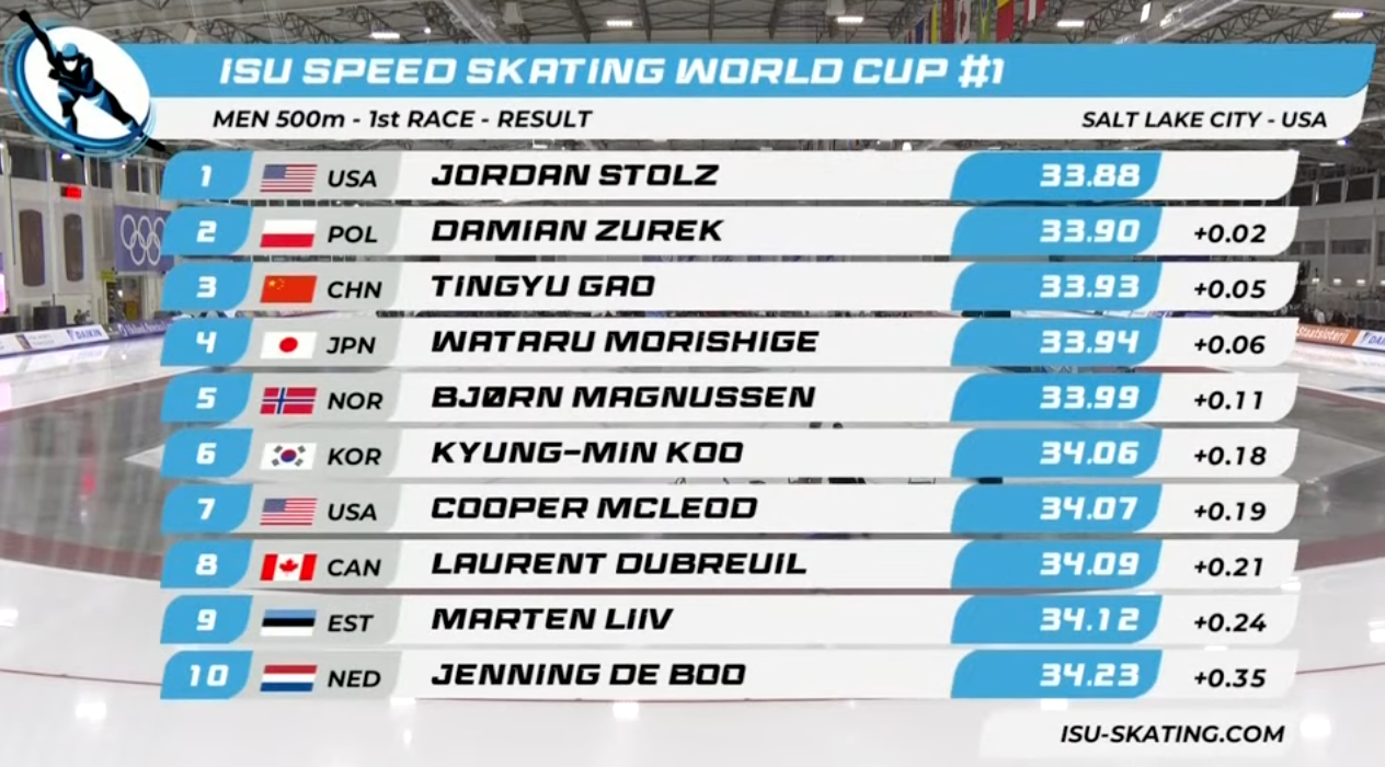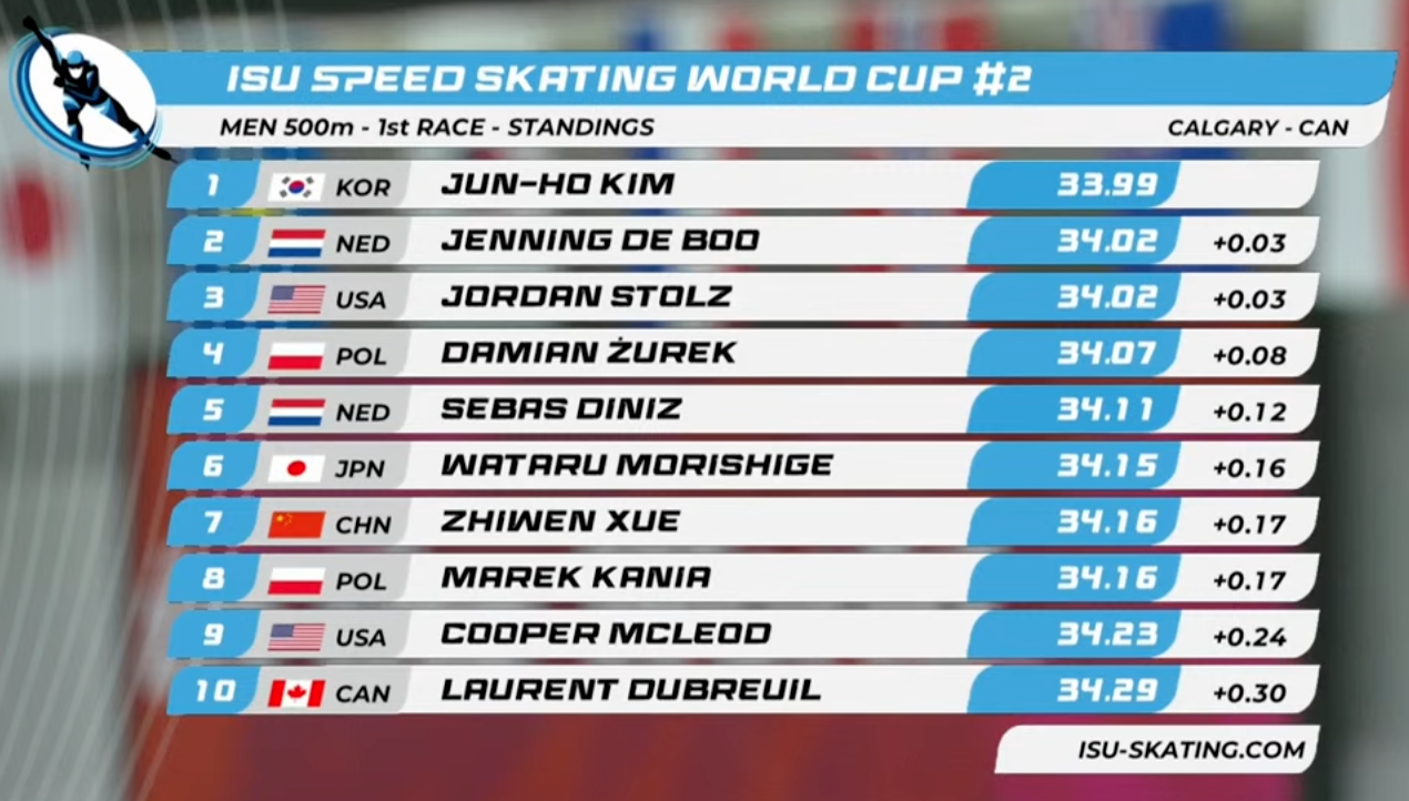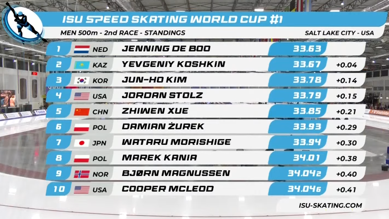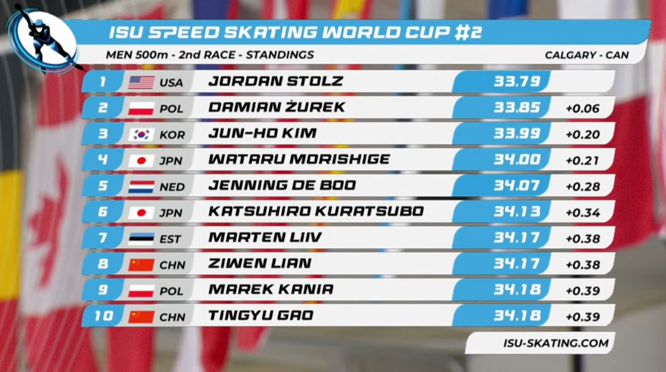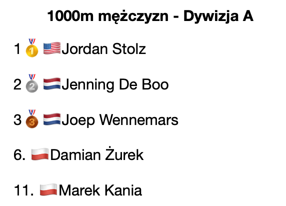 Pięknie mija nam wieczór z łyżwiarskim Pucharem Świata w 🇳🇴Hamar. Po sukcesie naszych panczenistek, mamy kolejny doskonały występ reprezentanta Polski. 🇵🇱Damian Żurek na trzecim miejscu w biegu na 500m! Zwycięża 🇺🇸Jordan Stolz z nowym rekordem toru.#SpeedSkating