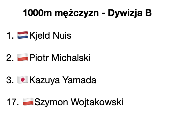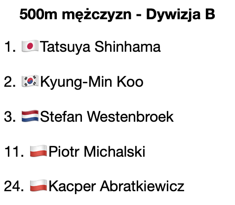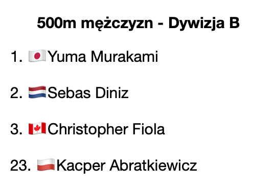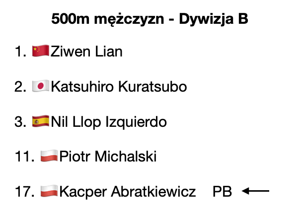 🏆14:17 – 500m mężczyzn – Dywizja B – 1 bieg – (🇵🇱K. Abratkiewicz, P. Michalski, M. Śliwka) – Wyniki
