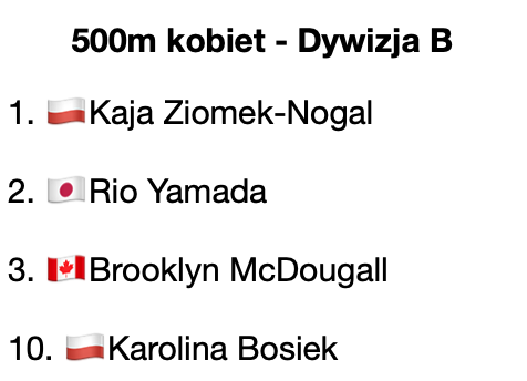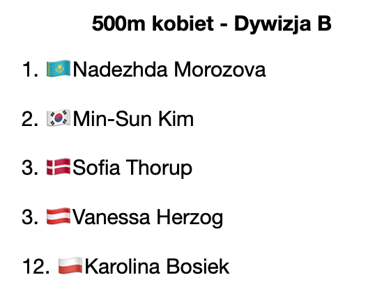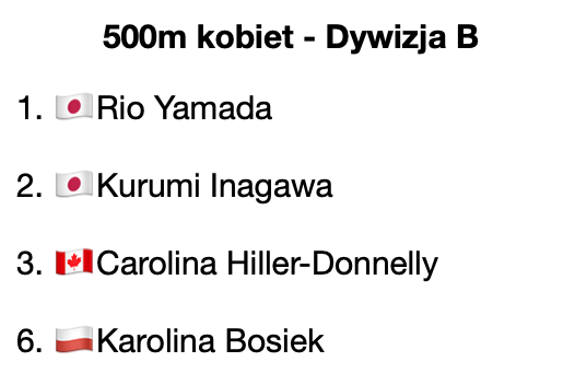 🏆13:40 – 500m kobiet – Dywizja B – 1 bieg (🇵🇱K. Bosiek) – Wyniki
