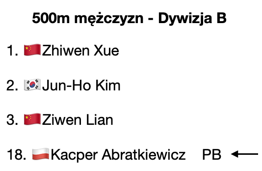 🏆18:58 – 500m mężczyzn – Dywizja A – 1 bieg (🇵🇱D. Żurek) – Wyniki