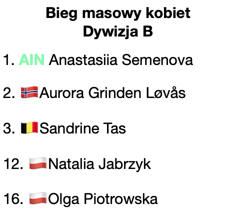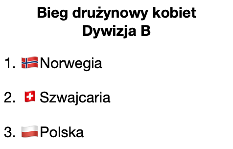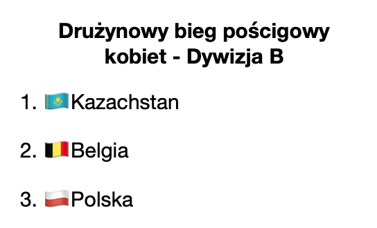 🏆09:10 – Drużynowy bieg pościgowy kobiet – Dywizja B (🇵🇱Polska) – Wyniki