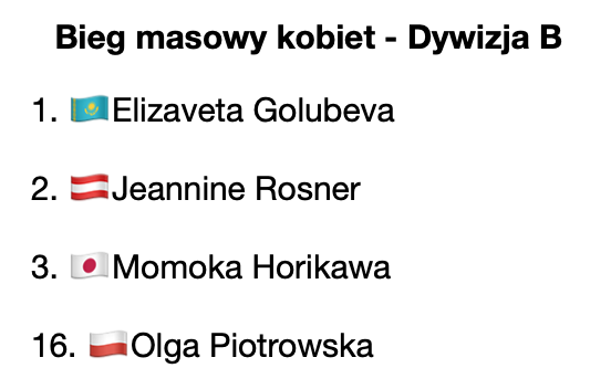 🏆11:19 – Bieg masowy kobiet – Dywizja B (🇵🇱O. Piotrowska, N. Jabrzyk) – Wyniki