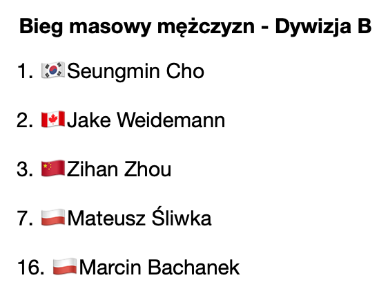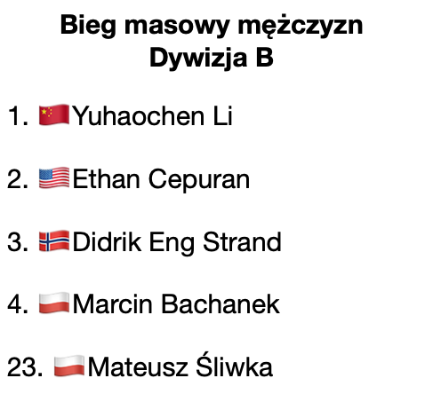 🏆11:40 – Bieg masowy mężczyzn – Dywizja B (🇵🇱M. Bachanek, M. Śliwka) – Wyniki